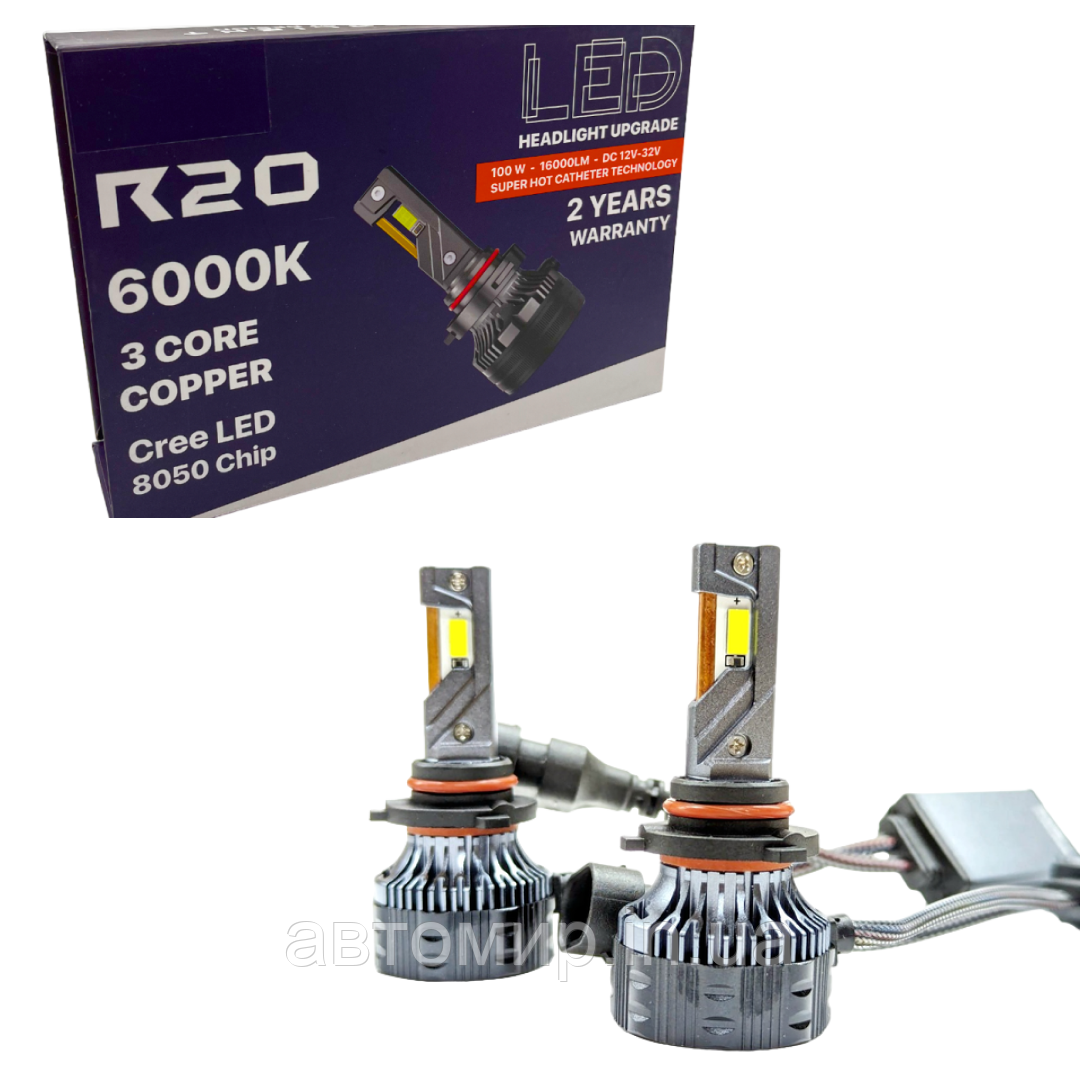 - LED комплект R20 з лампами типу НВ4 (9006) створений для поліпшення освітлення на дорогах у будь-яких умовах. Потужний світловий потік 18 000 люмен забезпечує яскраве і чітке світло з колірною температурою 6000K, що робить його наближеним до денного освітлення. Використовуються високоефективні діоди CREE4575CHIP, які в поєднанні з активною системою охолодження (радіатор і вентилятор) гарантують стабільну роботу і запобігання перегріву.
